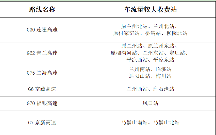 ?。ㄒ唬└咚俟分攸c路段。以蘭州為中心的放射線及其聯(lián)絡(luò)線為重點。如:G30連霍高速,G22青蘭高速,G6京藏高速,G70福銀高速,G75蘭海高速,S1機(jī)場高速等路段及相關(guān)收費站、服務(wù)區(qū)。