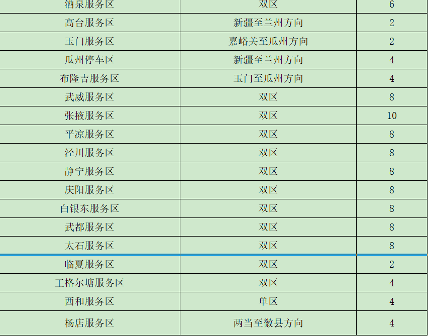 ?。ǘ┲攸c客運車站班線。省內(nèi)二級及以上客運站正常營運,以省會城市、人口密集市縣的站點及之間的班線為重點。如:蘭州客運東站、南站,天水汽車站等站點以及蘭州—定西、蘭州—西峰、臨洮—平川、舟曲—武都、金昌—武威等客運班線。 (三)車流量較大服務(wù)區(qū)。預(yù)計我省車流量較大服務(wù)區(qū)為定西服務(wù)區(qū)、酒泉服務(wù)區(qū)、武威服務(wù)區(qū)、高臺服務(wù)區(qū)、長城驛服務(wù)區(qū)、靜寧服務(wù)區(qū)、會寧服務(wù)區(qū)、太石服務(wù)區(qū)、蘭州北服務(wù)區(qū)、接駕嘴服務(wù)區(qū)、永登服務(wù)區(qū)。
