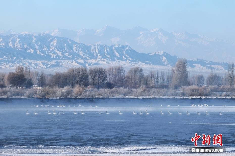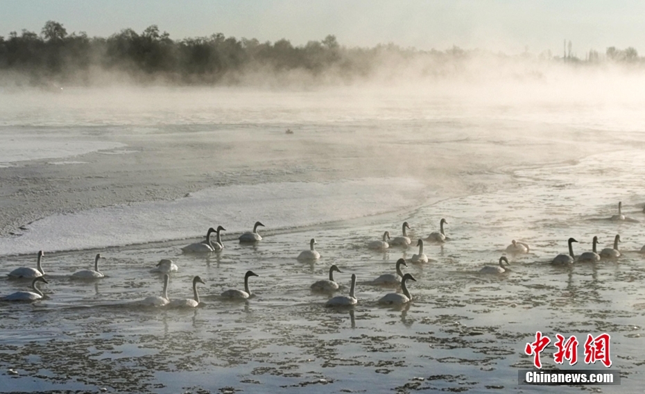 1月21日清晨,甘肅張掖市黑河國家級自然保護區(qū),受低溫影響,黑河水面霧氣氤氳縹緲,天鵝在水中暢游,野鴨等候鳥在空中飛舞,宛如一幅水墨生態(tài)畫卷。圖/CNSphoto 成 林 攝