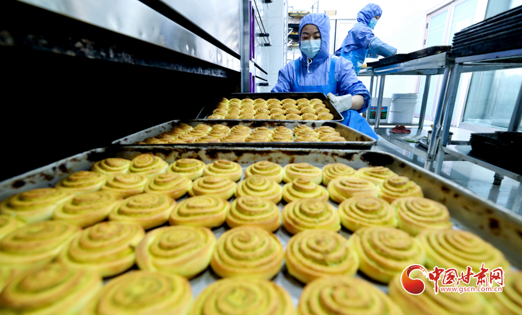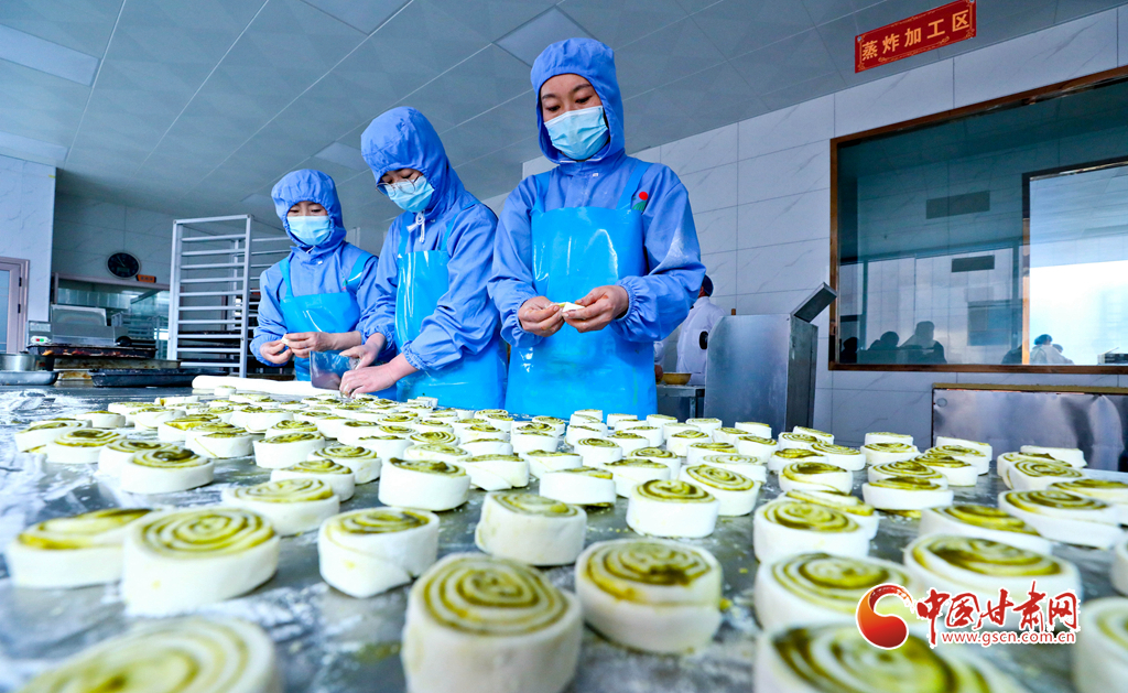 甘肅省張掖市山丹縣一食品加工坊,工作人員正在炸制“糖花子”。