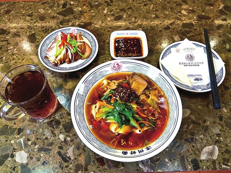 涼州,不僅有悠久的歷史、燦爛的文化,而且有回味無(wú)窮的美食。每天中午時(shí)分,位于雷臺(tái)綜合體的古凉韻“三套車”店里,食客絡(luò)繹不絕。從北京遠(yuǎn)道而來(lái)的程先生一行四人,特地前來(lái)打卡武威的這道特色美食。一碗行面、一盤鹵肉、一杯茯茶的組合,讓他們吃得津津有味。