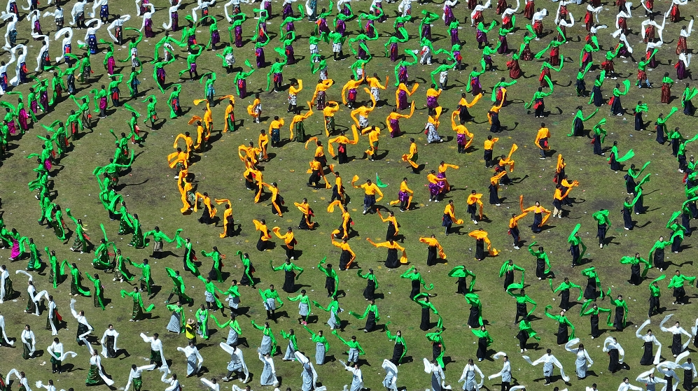 在歡快優(yōu)美的樂曲聲中,萬人鍋莊開始展演,動聽的樂曲、颯爽的舞姿、五彩的服裝,將甘南的生態(tài)之美、文化之美、民俗之美、和諧之美展示得淋漓盡致。圓圈形的鍋莊舞表達(dá)了甘南人民在中國共產(chǎn)黨領(lǐng)導(dǎo)下,各民族像石榴籽一樣緊緊擁抱在一起,為推動甘南高質(zhì)量發(fā)展,畫出最大同心圓。