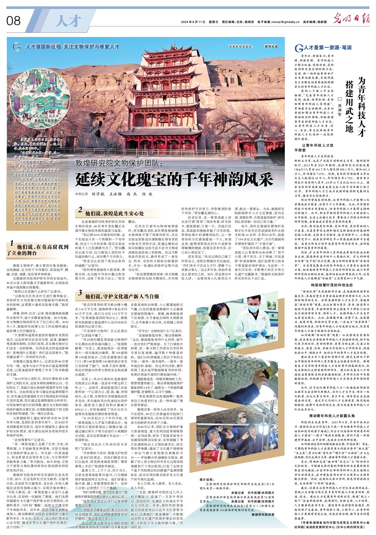 敦煌研究院保護研究所副所長武發(fā)思介紹,如今,無論是研究歷史文獻的、石窟考古的,還是研究古建筑的、音樂的,年輕人都能在這里找到展示能力、實現(xiàn)價值的舞臺,“年輕人都說,老一輩莫高窟人沒有什么豪言壯語,但卻將一切獻給了敦煌。他們也要懷揣著對文化遺產(chǎn)保護事業(yè)的無限熱忱,向榜樣看齊,與時間‘賽跑’,延續(xù)文化瑰寶的千年神韻風(fēng)采。近年來,團隊不斷有新鮮血液加入,推動敦煌研究院的文物保護力量不斷科學(xué)化、專業(yè)化、系統(tǒng)化,也讓我們更有信心去實現(xiàn)‘建設(shè)世界文化遺產(chǎn)保護的典范’這個目標(biāo)。”