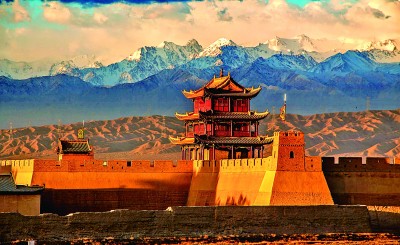 雄關(guān)六百載,長城越千年??唇癯瓯谥?,嘉峪關(guān)關(guān)城的朱色城樓與終年皚皚的祁連雪峰交相輝映,歷經(jīng)風(fēng)霜久而彌堅;峭壁之巔,長城第一墩矗立于此,腳下流淌的討賴河水澎湃不息;山脊之上,懸壁長城形似凌空倒掛,氣勢雄偉。