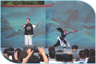 主詩會現(xiàn)場,氣勢恢弘的武術(shù)表演,精彩絕倫的拿手絕技,美輪美奐的崆峒山景,蕩氣回腸的武林唱響,組成一幅幅震天動地的美麗畫卷。伴著《少林,少林》《中國功夫》的歌聲,中岳武校功夫表演團數(shù)套行云流水的少林武術(shù),豪氣干云、笑逸蒼茫,一招一式古風流存,展現(xiàn)出少林武者英雄豪杰的氣魄與豪邁,演繹了少林武魂的禪武精神。這些平常只能在電影或電視中才可以看到的少林武功,而今就在眼前,觀眾們紛紛報以熱烈掌聲。武與舞的“對話”,武與舞的“相遇”詮釋鐵血丹心、俠骨柔情。由平?jīng)鰫郯鹏嵛璧概嘤栔行膸砦璧浮锻跄敢寡纭罚ㄟ^王母夜宴的歡樂場景,將西王母和周穆王相愛的神話故事深情講說,情濃處,千回百轉(zhuǎn),柔腸百結(jié)。一曲《刀劍如夢》穿越時空而來,歌手用獨特的嗓音,將這首歌演繹得淋漓盡致,將觀眾帶入了一個感性而深沉的氛圍,帶領我們回到了那個充滿江湖氣息的瑰麗世界。“滄海一聲笑,滔滔兩岸潮,浮沉隨浪只記今朝,蒼天笑,紛紛世上潮,誰負誰勝出天知曉滄海笑……”一曲《滄海一聲笑》,營造了一股濃濃的中國俠士逍遙風,旋律步步低落,先抑后揚,峰回路轉(zhuǎn),觀眾隨著音樂的意象一步步陷入蒼涼和寂寥中。隨著歌曲的高跌起伏,一個個精彩的片段定格為現(xiàn)場觀眾一張張手機影像。
