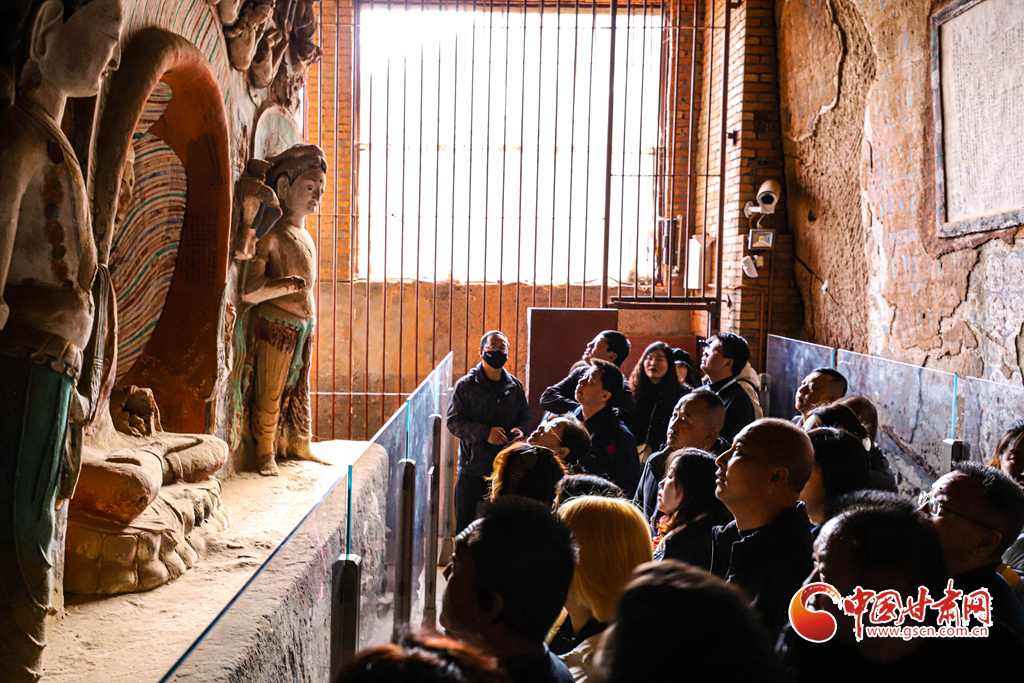 11月9日,甘肅省張掖市肅南裕固族自治縣馬蹄生態(tài)文化旅游景區(qū)金塔寺石窟內(nèi),甘肅百家旅行社的導(dǎo)游們正在仔細(xì)觀賞千年石窟。