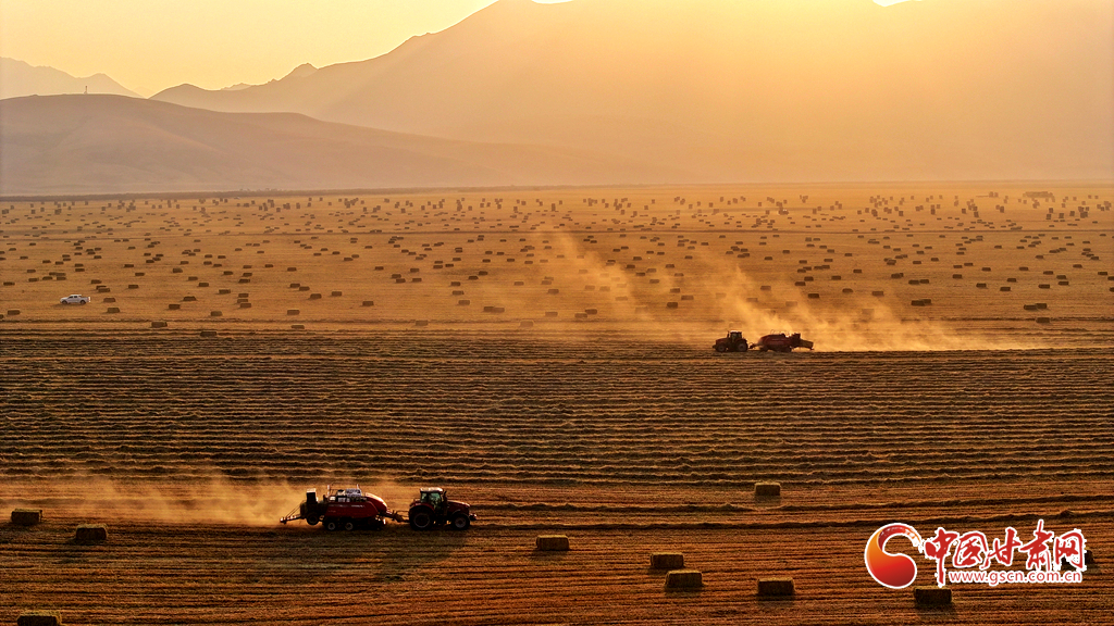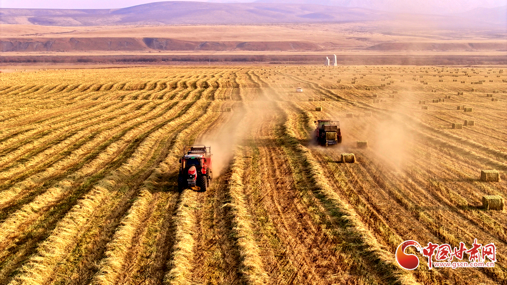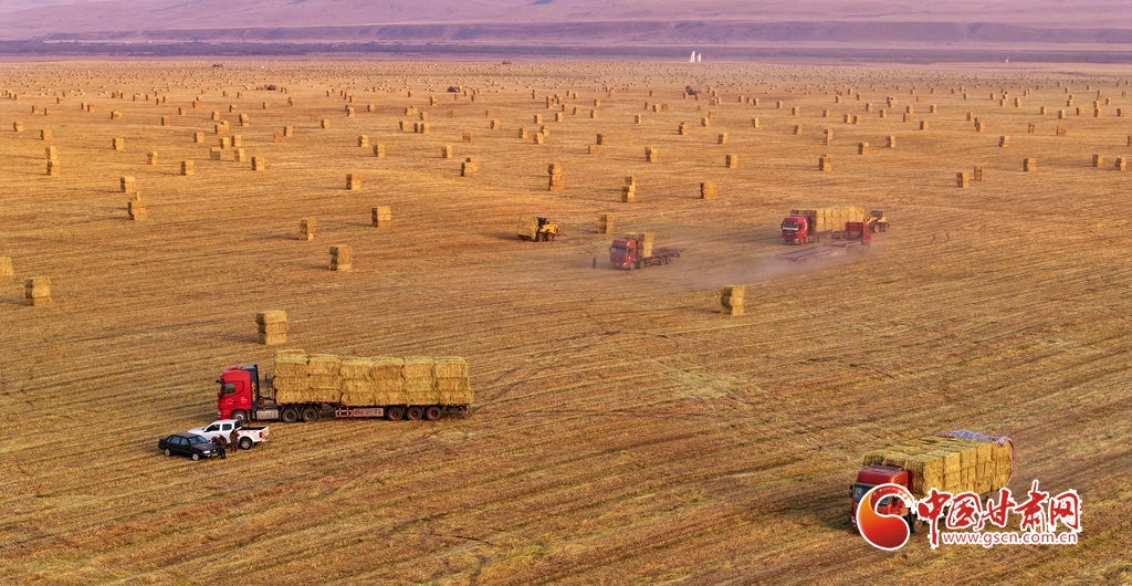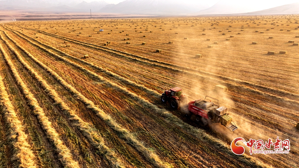 11月11日,甘肅山丹馬場的10萬畝燕麥草進(jìn)入打包高峰期,田野上呈現(xiàn)出一派繁忙而有序的景象。放眼田間,大型農(nóng)用機(jī)械來回穿梭,將燕麥草迅速壓縮、打包,一個(gè)個(gè)草捆整齊排列。與此同時(shí),滿載草捆的運(yùn)輸車在田間小道上來回奔波,將成品送往倉庫和銷售地。