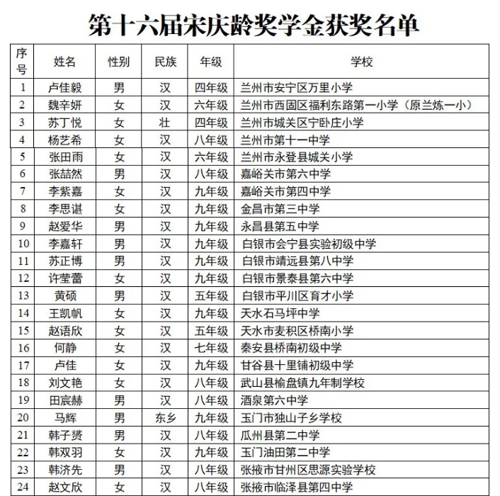 日前,經(jīng)地方各級教育行政部門推薦,第十六屆宋慶齡獎(jiǎng)學(xué)金獲獎(jiǎng)名單公布,全國共有1542名學(xué)生獲獎(jiǎng),其中甘肅56人。