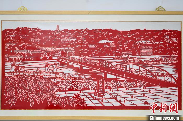 圖為展出以蘭州標(biāo)志性建筑中山橋?yàn)橹黝}的剪紙作品。中新社記者 九美旦增 攝