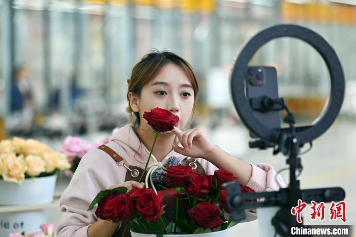 11月20日,在甘肅省臨夏回族自治州臨夏市百益億農(nóng)國際鮮花港內(nèi),工作人員進行網(wǎng)絡(luò)直播售賣鮮切玫瑰。九美旦增 攝
