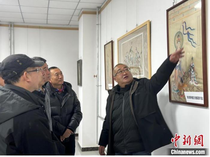 12月17日,由蘭州市七里河區(qū)委宣傳部、七里河區(qū)文體旅局聯(lián)合舉辦的“大漠孤陽映彩霞 敦煌神韻美如畫”新時代文明實踐主題活動暨敦煌巖彩畫書畫藝術展拉開帷幕。圖為展覽組織者為參觀者講解展出的作品。楊娜 攝