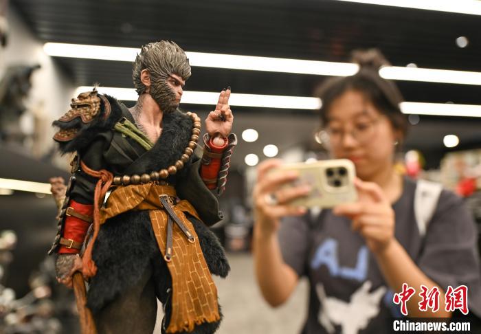 8月23日,《黑神話:悟空》人偶手辦生產(chǎn)企業(yè)內(nèi),展出的“天命人”吸引參觀者。王剛 攝