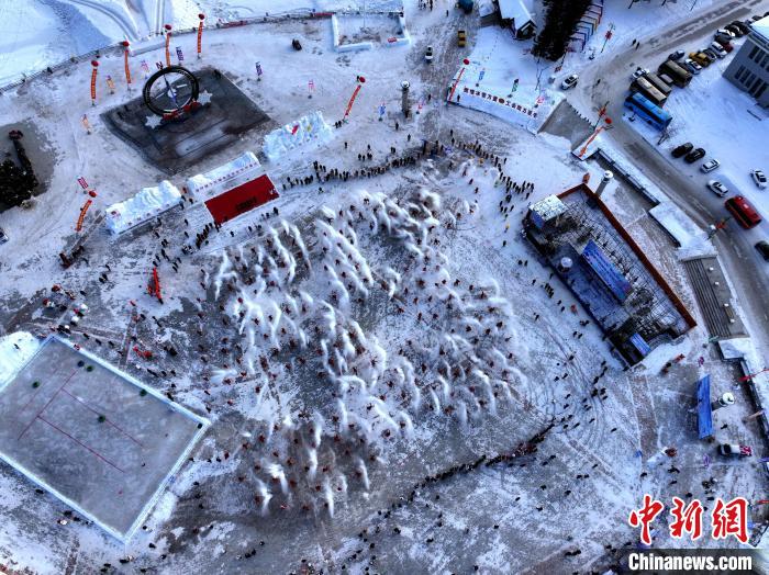 當(dāng)日,北極村七星廣場(chǎng)上,身披紅斗篷、頭戴紅帽子的游客和當(dāng)?shù)鼐用窠M成一個(gè)巨大的“53°”造型。伴隨著激情澎湃的音樂(lè),他們擺好姿勢(shì),將手中熱水奮力一灑,齊聲高喊“極致興安嶺 潑出好風(fēng)景”,一道道劃破天際的弧線(xiàn),碰撞出的神奇光影。震撼的場(chǎng)面讓現(xiàn)場(chǎng)游客驚呼不已,他們紛紛舉起手機(jī)定格這個(gè)精彩瞬間。