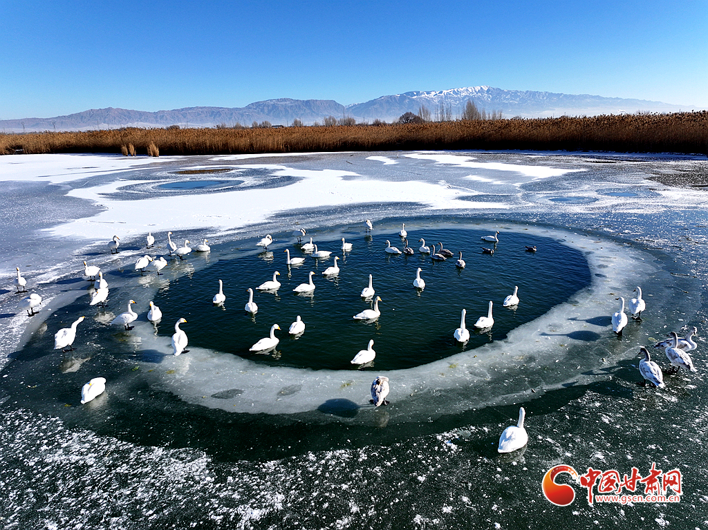 近日,在甘肅省張掖國家濕地公園,成群的越冬天鵝在冰封的湖面上悠然覓食、嬉戲,構(gòu)成了一幅動人的生態(tài)畫卷,成為冬日里一道尤為引人注目的風景線。
