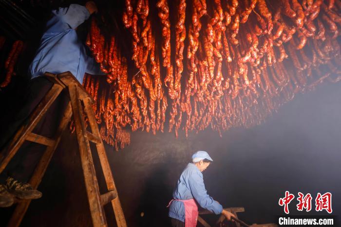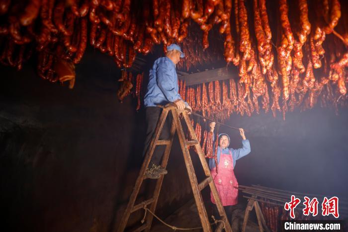 圖為貴州施秉一企業(yè)工人在下架剛熏制好的香腸。新年臨近,貴州省黔東南苗族侗族自治州施秉縣部分農(nóng)戶和企業(yè)紛紛加工趕制臘肉、香腸、血豆腐等傳統(tǒng)臘味,通過“線上+線下”銷售方式,供應(yīng)市場,喜迎新年。磨桂賓 攝