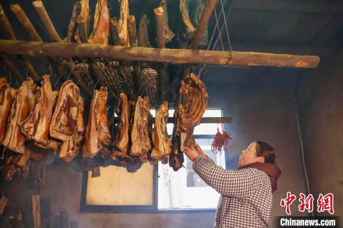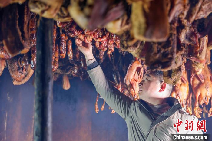 圖為貴州施秉云臺村一農(nóng)家樂業(yè)主在查看熏制臘肉、香腸的情況。磨桂賓 攝