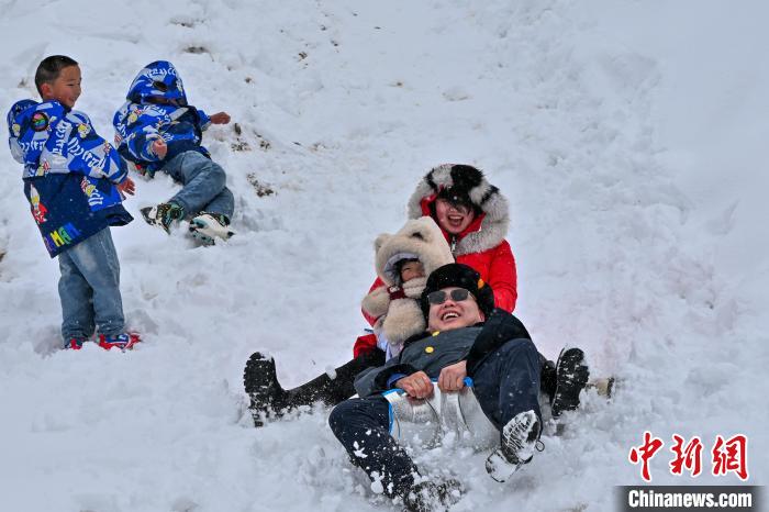 3月2日,云南省迪慶藏族自治州香格里拉市迎降雪天氣,市民自制雪板樂享雪趣。李嘉嫻 攝