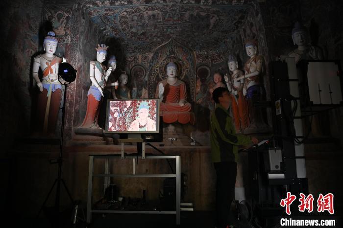 2024年6月5日,甘肅省敦煌市莫高窟內(nèi),敦煌研究院文物數(shù)字化研究所工作人員進(jìn)行敦煌壁畫數(shù)字化采集工作?!≈行律缬浾?nbsp;李亞龍 攝