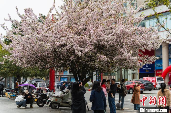 圖為3月16日,棠湖公園正大門處,垂絲海棠盛開,市民在此拍照打卡。韓金雨 攝