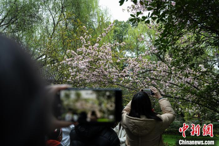 圖為3月16日,棠湖公園內(nèi),垂絲海棠盛開,市民爭相拍照打卡。韓金雨 攝