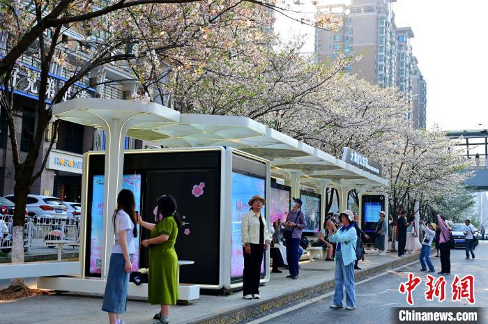 圖為市民游客在珞喻東路大黃村公交站候車、拍照。劉康 攝