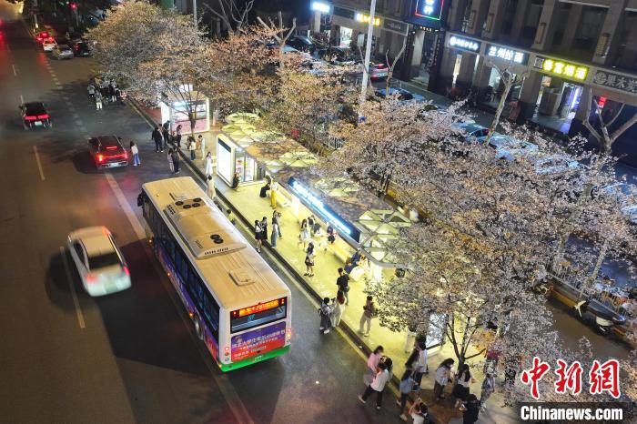 圖為夜間的珞喻東路大黃村公交站,櫻花在光影中呈現(xiàn)別樣魅力。劉康 攝