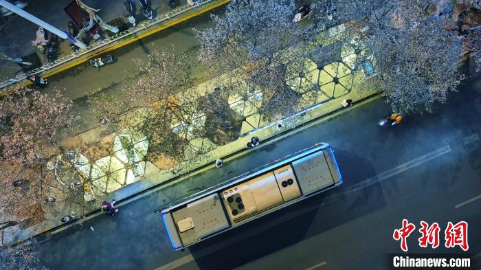 3月26日,被譽為武漢“最美櫻花車站”的珞喻東路大黃村公交站櫻花盛放。經(jīng)過改造的大黃村公交站,新增了自助售貨機、衛(wèi)生間、共享充電寶等便民設(shè)施,煥然一新的科技智慧站臺與粉白如霞的櫻花相映生輝。微風(fēng)吹過,櫻花花瓣浪漫飄零,吸引不少市民游客觀賞“打卡”。圖為公交車在珞喻東路大黃村公交站停留。(無人機照片)劉康 攝