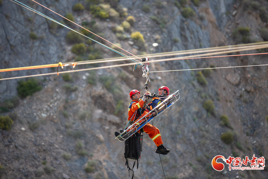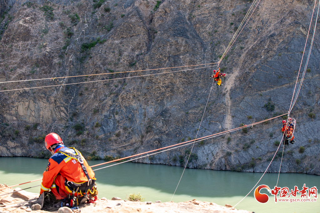 消防救援人員利用“T型救援”系統(tǒng)營救被困人員