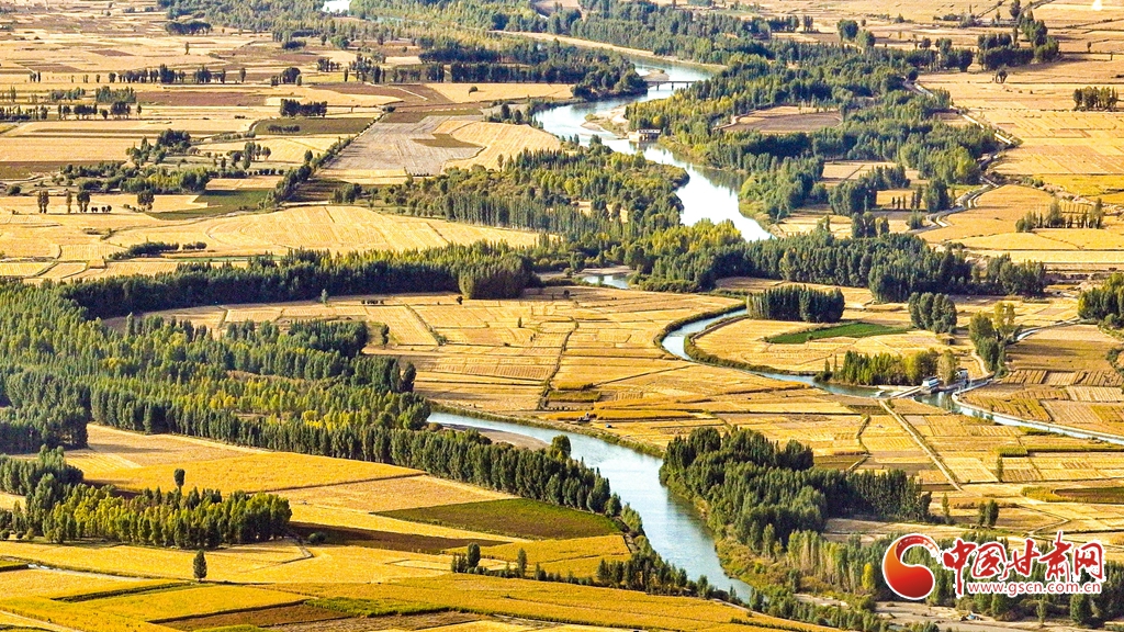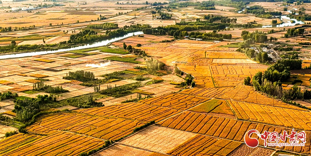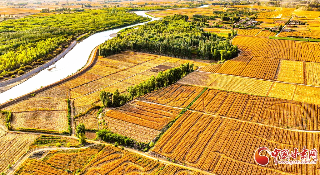 9月26日傍晚,夕陽(yáng)映照下的黑河張掖臨澤縣鴨暖鎮(zhèn)段,蜿蜒流淌的河水與兩岸鋪滿金色的大地交相輝映,盡顯盎然生機(jī),共同勾勒出一幅金秋豐收的壯美畫(huà)卷。