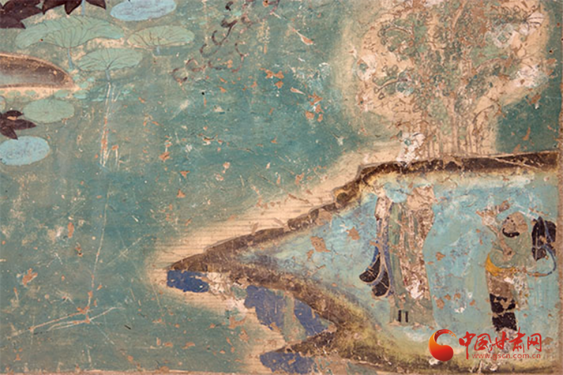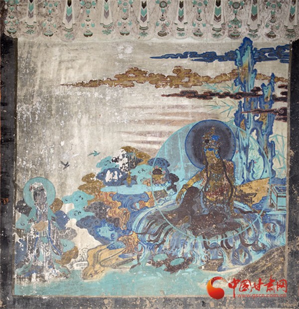 兩幅作品均以青綠色調(diào)為主,觀(guān)音面部貼金雖已氧化,卻仍顯清新淡雅,更以“馬一角、夏半邊”的構(gòu)圖巧思,用對(duì)角線(xiàn)分割畫(huà)面、大量留白,讓有限的壁面生出無(wú)窮空間感,堪稱(chēng)中國(guó)傳統(tǒng)美學(xué)與佛教哲理的完美融合——正如唐代白居易贊水月觀(guān)音“凈淥水上,虛白光中”,這般意境在榆林窟的壁畫(huà)里被演繹得淋漓盡致。