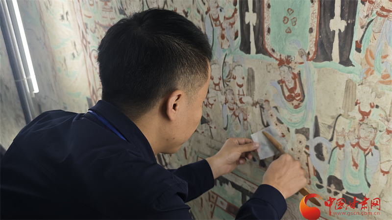 唐青松曾經(jīng)是一名莫高窟講解志愿者,在手電筒的柔和光源之下,他能更清楚看到壁畫里的病害,也更焦急如何更好保護(hù)壁畫,所以當(dāng)有機(jī)會(huì)成為壁畫修復(fù)師,他便拿起了保護(hù)工具,用五年時(shí)間傾心學(xué)習(xí),終于有了走進(jìn)洞窟修復(fù)壁畫的機(jī)會(huì)。