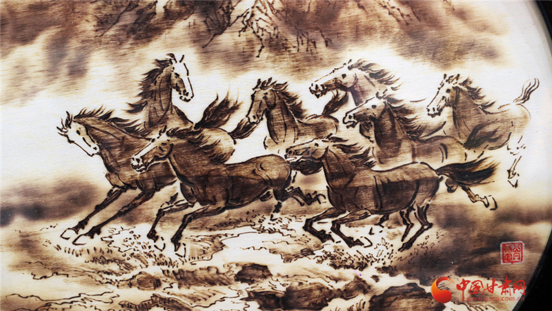 從學(xué)徒到代表性傳承人,張志光的堅(jiān)守藏在日復(fù)一日的練習(xí)里。他不僅精通山丹烙畫的選材、畫面設(shè)計(jì)及裝飾工藝,更在2018年邁出創(chuàng)新步伐——將山丹馬元素融入創(chuàng)作。手持電烙鐵在木板上游走,他筆下的山丹馬或奔騰跳躍、或昂首嘶鳴,線條流暢、明暗有致,仿佛被賦予生命,盡顯西北大地的豪邁神韻。“山丹烙畫是我一生的熱愛,早成了生活里離不開的部分。”張志光的話語里,滿是對(duì)這門技藝的深情。
