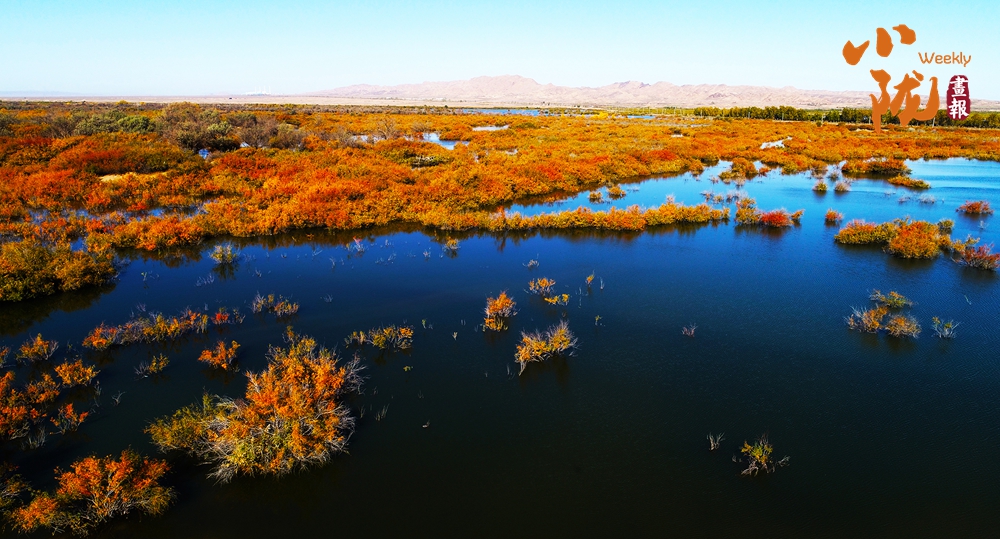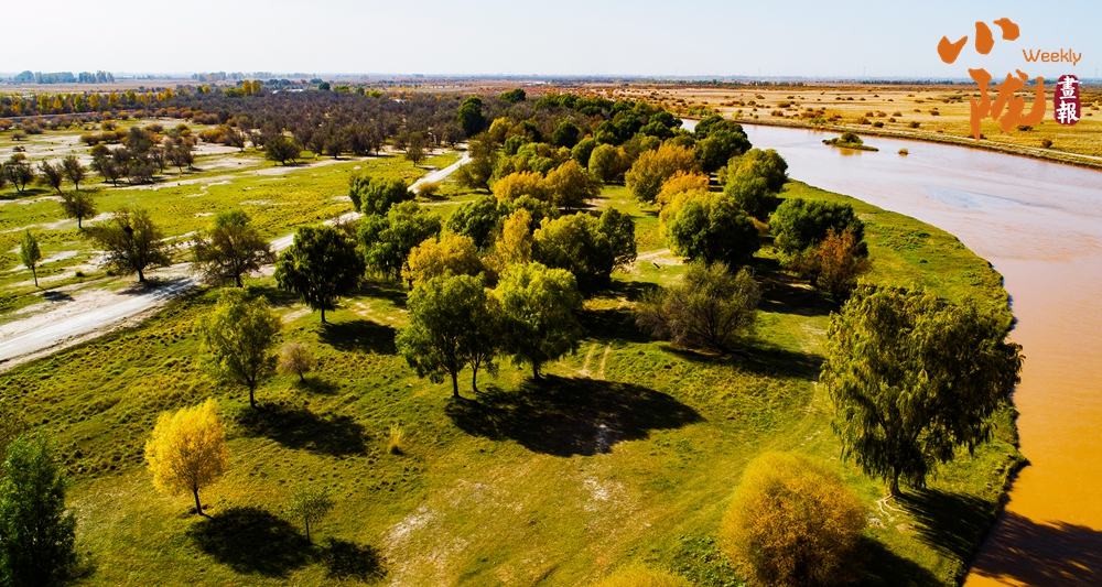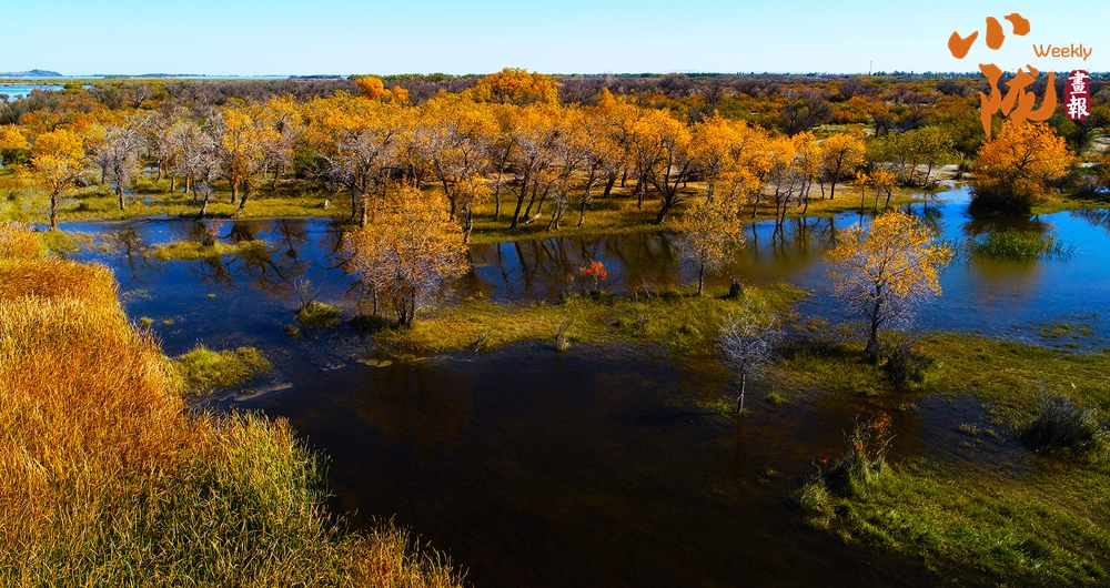 金色胡楊在陽光下泛著溫暖光澤,斑斕絢麗的蘆葦如金色絲帶點(diǎn)綴荒漠,與碧綠河水、湛藍(lán)天空構(gòu)成濃墨重彩的秋日?qǐng)D景。