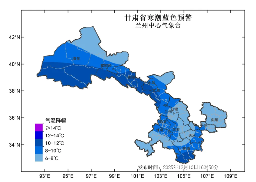 蘭州中心氣象臺2025年12月10日16時50分發(fā)布寒潮藍色預(yù)警:預(yù)計11日至13日清晨,全省大部自西向東最低氣溫下降6-8℃,其中河西五市、隴南等部分地方及隴中局部地方下降8~10℃,局地可達10℃以上,上述部分地方將出現(xiàn)寒潮。河西五市降溫時段為11日白天至12日白天,省內(nèi)其余地方降溫時段為11日夜間至13日清晨。請注意防范!