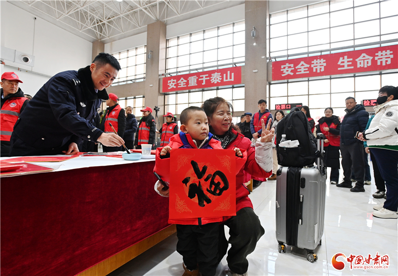 活動現(xiàn)場設(shè)置了“平安送福”“登車叮囑”等宣傳服務(wù)項(xiàng)目,現(xiàn)場為旅客、駕駛?cè)速浰痛郝?lián)、福字,提醒春運(yùn)文明安全出行。