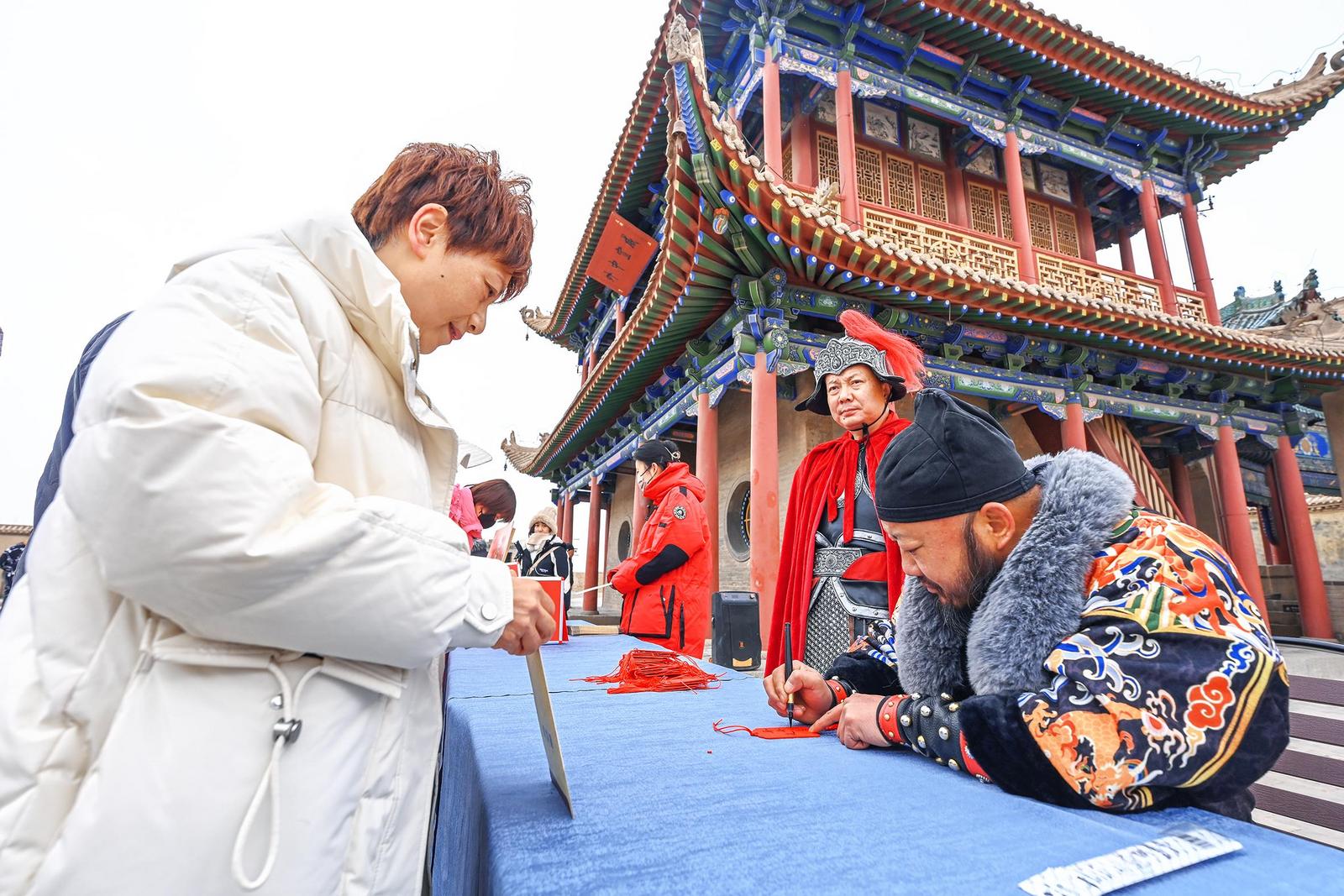 “雄關(guān)迎瑞 歡度新春”。春節(jié)假期,嘉峪關(guān)關(guān)城景區(qū)組織開展尋寶探秘、關(guān)長賜福等多項(xiàng)互動活動,在歡聲笑語中為游客送上新春祝福。(記者 徐霏 李巍 攝)